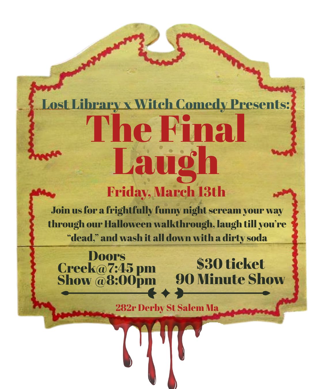 On the unluckiest night of the year, Salem summons something truly terrifying…. Stand up comedians. Join us in our black box theater for a horror-inspired comedy showcase featuring special guests as well as complimentary dirty soda from Shore Sips Co. featuring our premium vintage sodas. Expect dark humor, unlucky tales and slasher nostalgia. Use code FRIDAY13TH to get 13% off …